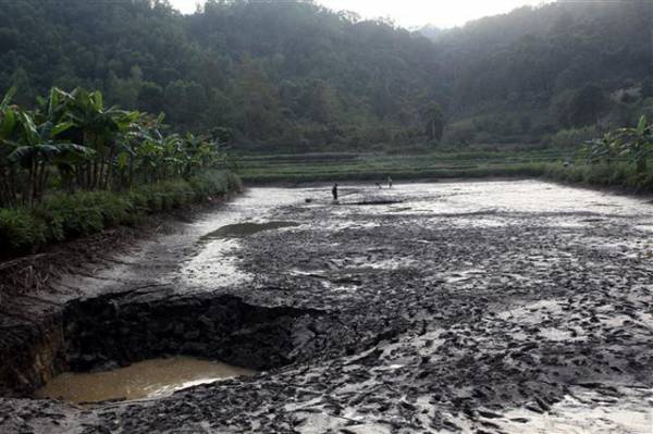 Hố sụt lún “hút“ cạn cả nước lẫn cá. Ảnh: Đức Hiếu - TTXVN