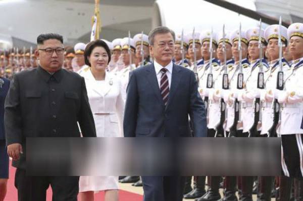 Nhà lãnh đạo Triều Tiên Kim Jong-un (trái) trong lễ đón Tổng thống Hàn Quốc Moon Jae-in (giữa, phía trước) tại Bình Nhưỡng ngày 18/9/2018. Ảnh: YONHAP/ TTXVN