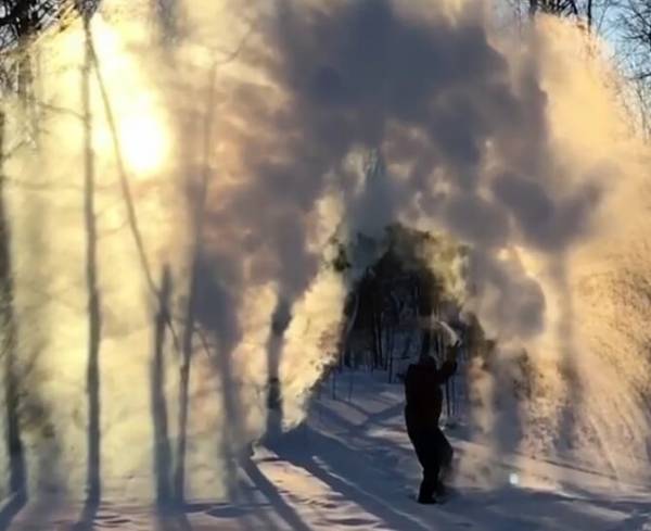 Giữa khung cảnh trắng xóa được bao phủ bởi lớp tuyết dày, người đang ông thử hất ca nước sôi ra ngoài. Ngay khi tiếp xúc với nhiệt độ cực lạnh, nước sôi đóng băng và hóa thành bụi tuyết ngay lập tức tạo nên khung cảnh ’ảo diệu’ không ngờ.