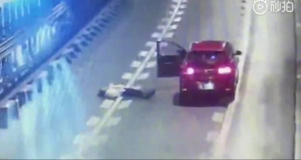 Camera giám sát cho thấy cô gái ra khỏi chiếc ô tô đang đỗ bên đường cao tốc, rồi nằm ra giữa đường, dùng cơ thể chặn cả hai làn xe.