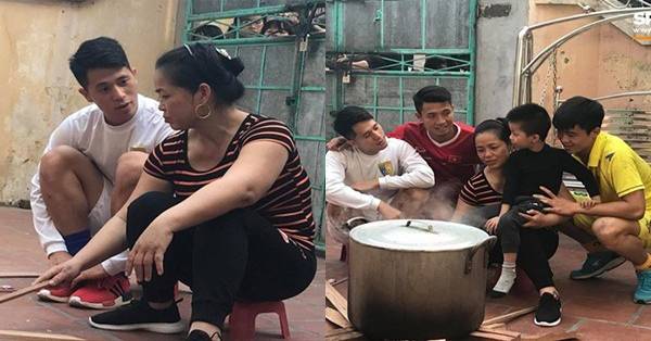 Về nhà Duy Mạnh chơi, Đình Trọng và Dũng 4 được đón tiếp nồng nhiệt, còn ngồi canh bánh chưng cùng mẹ Duy Mạnh (nguồn ảnh: Sport5)