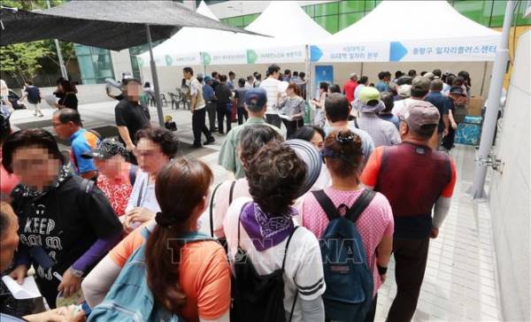 Người tìm việc xếp hàng tại hội chợ việc làm ở Seoul, Hàn Quốc. Ảnh: Yonhap/TTXVN