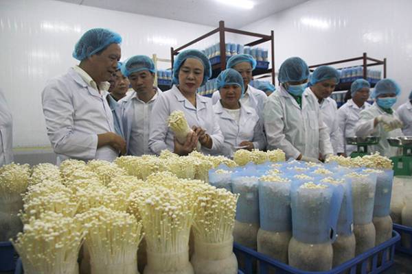 Phó bí thư Thành ủy Hà Nội Ngô Thị Thanh Hằng thăm mô hình sản xuất nấm ăn, nấm dược liệu ứng dụng công nghệ cao tại xã Đốc Tín (Mỹ Đức). Ảnh: Đỗ Hương