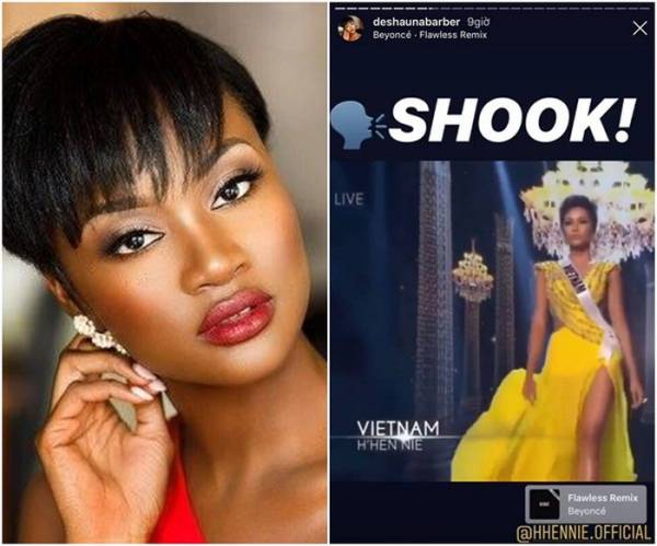 Trước đó, cựu Hoa hậu Mỹ đã từng thể hiện sự mến mộ H’Hen Niê khi theo dõi đêm bán kết Hoa hậu Hoàn vũ 2018. Màn tung váy dạ hội tuyệt phẩm của đại diện Việt Nam khiến Deshauna Barber bị shock.