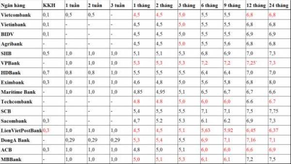 Theo đó, lãi suất tiền gửi kỳ hạn từ 1 đến dưới 3 tháng hiện tăng nhẹ từ 4,4%/năm lên mức 4,5%/năm; lãi suất tiết kiệm 3 tháng tăng từ 4,8%/năm lên 5%/năm.