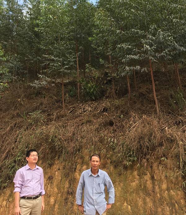 Giám đốc Công ty Cổ phần Lâm sản Lê Gia (trái) cùng ông Trường thăm khu rừng trồng của Công ty.