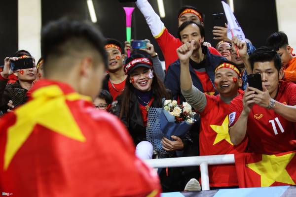 Từ trên khán đài, mong mỏi của người mẹ có con vừa vô địch AFF Cup 2018 là có thể chạm tay vào người Quang Hải. Hoặc là có thể xuống sân cùng con chia sẻ cảm xúc.