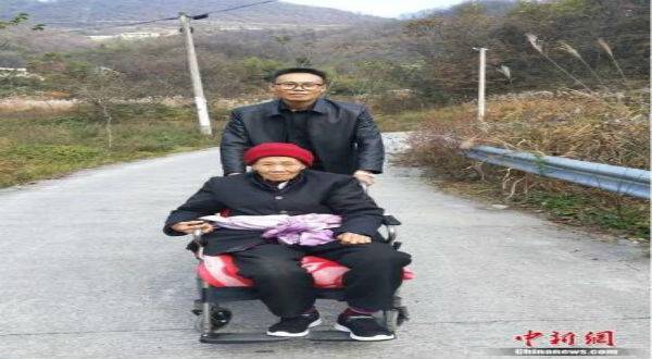 Một trong số những người con đẩy mẹ say xe. Ảnh: Chinanews.