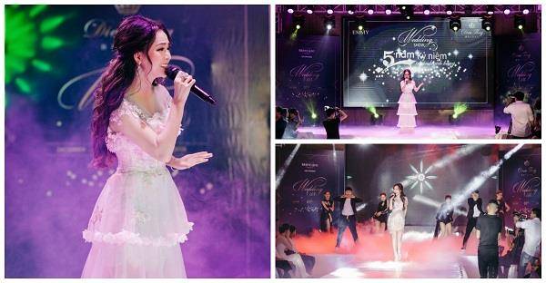 Đăng quang Quán quân ’Duyên Dáng Bolero 2018’, Trần Mỹ Ngọc đắt show event. Mới đây, nữ ca sĩ xinh đẹp có mặt tại Hải Phòng tham dự show diễn kỉ niệm 5 năm của một thương hiệu áo cưới. Mỹ Ngọc hát liên tục 4 ca khúc cả Bolero lẫn nhạc trẻ.