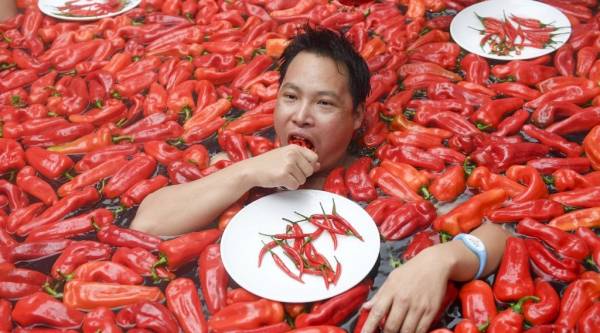 Khi thời tiết trở lạnh, có cách nào làm nóng cơ thể một cách nhanh chóng như ngâm mình trong suối nước nóng và ăn ớt tươi? Mới đây, tại một khu du lịch sinh thái bên ngoài thành phố Nghi Xuân, tỉnh Giang Tây, Trung Quốc đã tổ chức một cuộc thi kỳ lạ, cuộc thi ăn ớt trong bồn nước nóng. Và giành kỷ lục là một cô gái ăn 20 quả ớt trong vòng 1 phút.