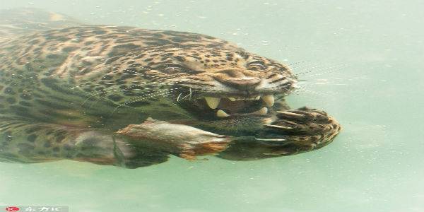 Trong hình, con báo đốm giương nanh múa vuốt, cố gắng cầm thật chặt con cá. Hai mắt của nó tròn vo, mở thật lớn, nhìn chằm chằm vào miếng ăn của mình, giống như sợ rằng chỉ cần sơ ý, miếng ngon tới tay sẽ bay mất. Hình ảnh vừa hài hước vừa thú vị.