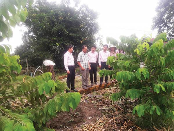 Anh Trần Thanh Long (thứ 2 từ trái sang) giới thiệu mô hình trồng mãng cầu Đài Loan và Thái Lan cho kinh tế cao.