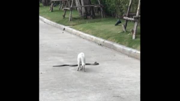 Một chú mèo trắng ở Thái Lan đã dũng cảm đối đầu với con rắn hổ mang chúa dài 1,8 mét. Kết quả con rắn sợ hãi và phải bò đi chỗ khác.