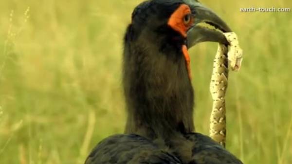 Một con rắn phì châu Phi vốn được mệnh danh là "cỗ quan tài sống" khi là thủ phạm gieo rắc nỗi kinh hoàng cho người dân châu Phi đã phải bỏ mạng trước con chim hồng hoàng hay còn gọi là phượng hoàng đất.