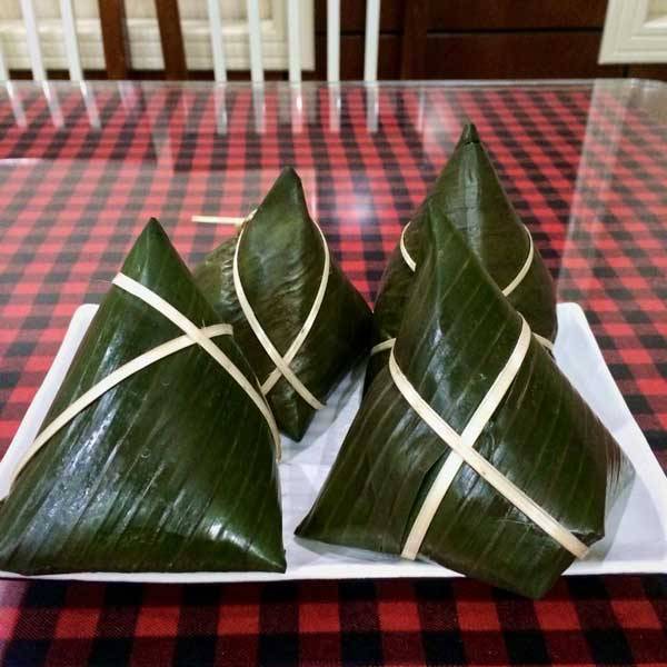 - Xếp 2 lớp lá để tạo thành hình chữ nhật, cỡ 20 x 25 cm. Đặt khuôn trong lên xếp theo các cạnh, cho vào khuôn ngoài. Rút khuôn trong ra, cho bột bánh + nhân vào. Gấp đáy. Gỡ khỏi khuôn, cột dây.