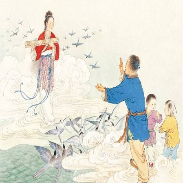 Một hôm, Chức Nữ và các nàng tiên trên trời xuống trần gian chơi, đi tắm ở sông. Dưới sự giúp đỡ của bò già, Ngưu Lang đã làm quen với Chức Nữ, sau đó hai người đã có tình cảm với nhau. Rồi Chức Nữ lén xuống trần gian, trở thành vợ của Ngưu Lang. Chức Nữ còn mang tằm từ thiên đình xuống cho dân làng, và dạy dân làng biện pháp nuôi tằm, rút tơ, dệt vải lụa mịn màng và bóng đẹp.
