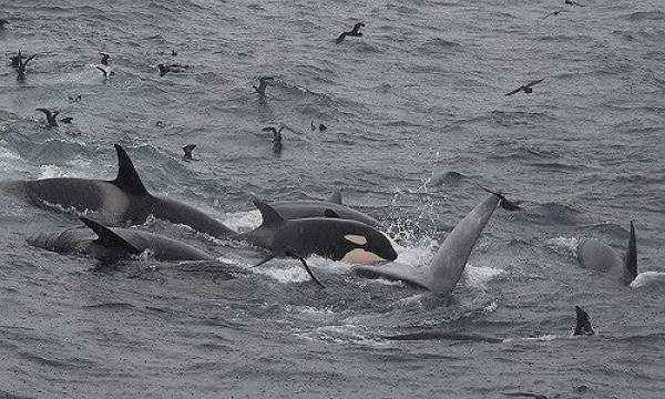 6 con cá kình hợp sức tấn công và dìm chết một con cá voi xanh quý hiếm dài 18 m ở ngoài khơi cách bang Western Australia 20 km về phía nam. Các chuyên gia đến từ Trung tâm nghiên cứu động vật biển có vú và Dự án cá kình chứng kiến cuộc săn mồi vào sáng ngày 21/3. Trong ảnh chụp, máu nhỏ ra từ xác cá voi khổng lồ, thấm đỏ một vùng biển, thu hút thêm 50 con cá kình khác gia nhập bữa đại tiệc.