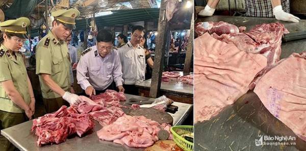 Các lực lượng chức năng kiểm tra hoạt động kinh doanh, buôn bán thịt lợn tại chợ Vinh. Ảnh: Võ Huyền