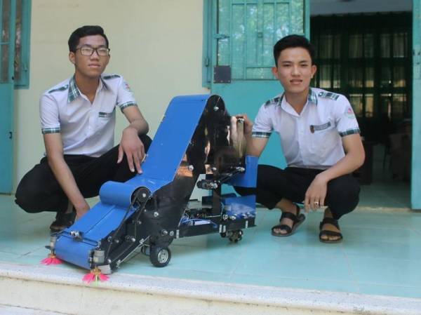 Đó là Nguyễn Hữu Thực và Trần Hoàng Nguyên, cùng lớp 11C4 Trường THPT Trường Chinh, xuất sắc với sản phẩm máy điều khiển tự động thu gom nông sản trên sân phơi.