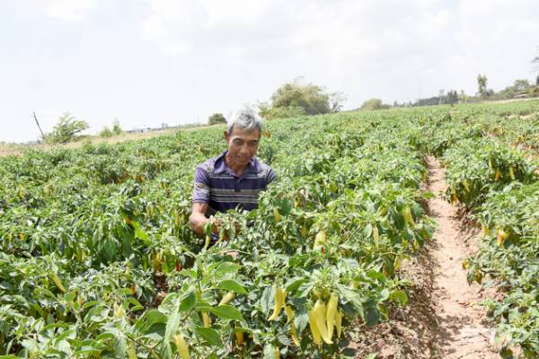 Ông Sơn Sim phấn khởi cho biết: “Trước đây, tôi trồng ớt chủ yếu trên các bờ vuông tôm nhưng mấy năm gần đây tôi trồng xen canh với hành tím. Khi hành tím được khoảng 40 ngày thì tôi bắt đầu trồng ớt. Đến khi hành được thu hoạch thì tưới nước, bỏ phân để ớt sinh trưởng và phát triển...".