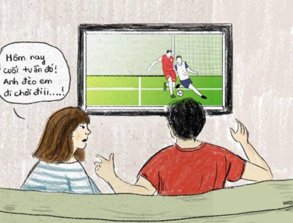 Trong lúc anh chồng chăm chú xem một trận bóng đá trên ti vi. Vợ anh đang đứng trên một cái thang quét vôi cho tường. Chị hỏi chồng: