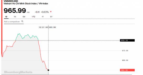 Sắc đỏ đã lấn át hoàn toàn trên HOSE với 221 mã giảm so với 59 mã tăng và 36 mã đứng giá tham chiếu. So với các chỉ số khu vực: NIKKEI 225 (-0,81%), Shanghai (-0,18%), HSI (-0,55%), VN-Index đang biến động cùng chiều khi giảm 0,63% xuống 965,99 điểm.