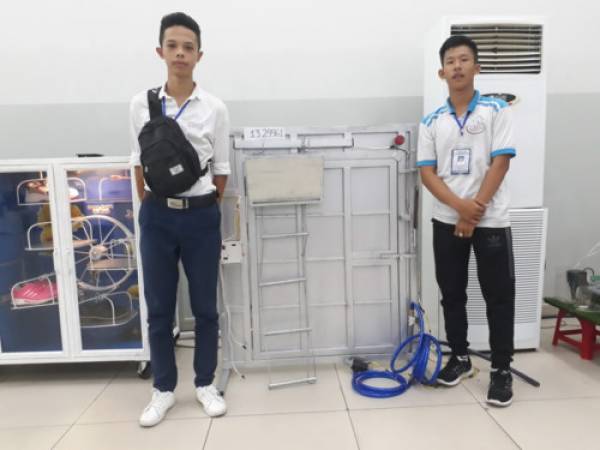 Hai học sinh và mô hình hệ thống chữa cháy tự động