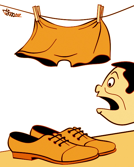 Trước khi vào nhà, tôi có thói quen nhìn lên giàn phơi quần áo ở hành lang. Mắt tôi như tóe lửa: Trên dây phơi là chiếc quần đùi nam giới bay phất phơ trước gió như trêu ngươi. Máu xông lên mặt nóng bừng, không kiềm chế được, tôi phóng nhanh hai bậc một lên gác. Cảnh tượng trước nhà tôi càng làm tôi sởn tóc gáy: Trên giá giày dép phía trong cửa chống trộm chễm chệ hai đôi giày, một nam, một nữ. Giày nữ là của vợ tôi, còn đôi giày nam mới cứng, bóng lộn tôi chưa thấy bao giờ!