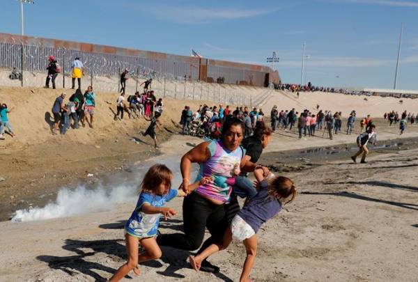 Một gia đình nhập cư chạy nhanh để tránh lựu đạn cay ở trước bức tường biên giới giữa Mỹ và Mexico. Ảnh: Kim Kyung Hoon