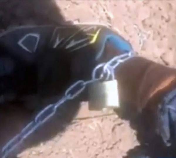 Chân của cậu bé bị trói bởi một chiếc xích sắt.