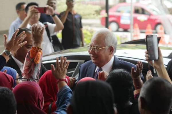 Najib đến phòng xử án với luật sư Tan Sri Muhammad Shafee Abdullah. Khi đến nơi, có khoảng một chục người ủng hộ.