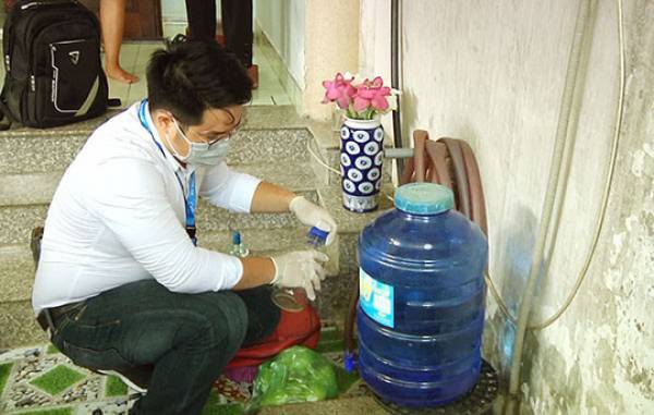 Lực lượng chức năng lấy mẫu nước dùng để chữa bệnh tại cơ sở ông Trịnh Xuân Vượng để kiểm tra, xét nghiệm