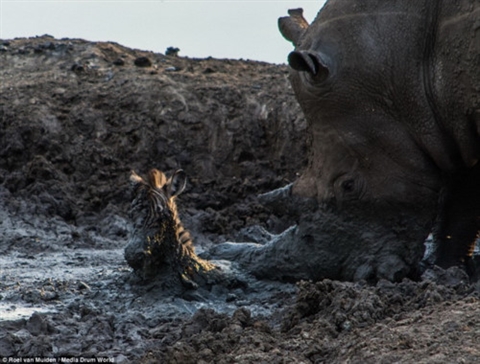 Ngựa vằn con bị mắc kẹt trong vũng bùn và được tê giác đến giải cứu.