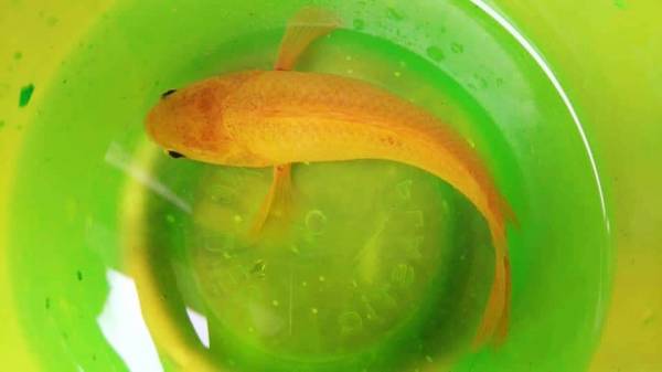 Con cá rô này dài khoảng 20cm, nặng khoảng hơn 300gram, từ đầu đến thân, vây, đuôi đều có màu vàng óng ánh trông cực lạ.
