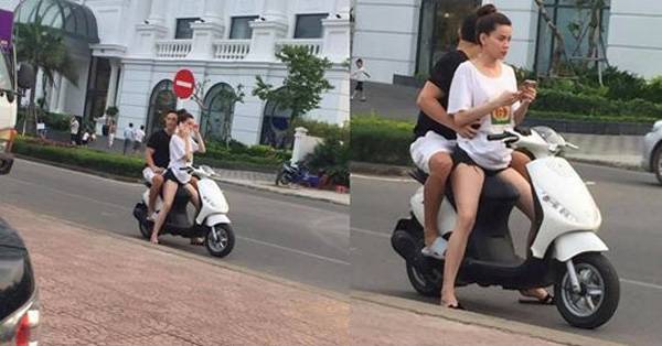 Hà Hồ đèo Kim Lý bằng xe gắn máy dạo phố ngày lễ