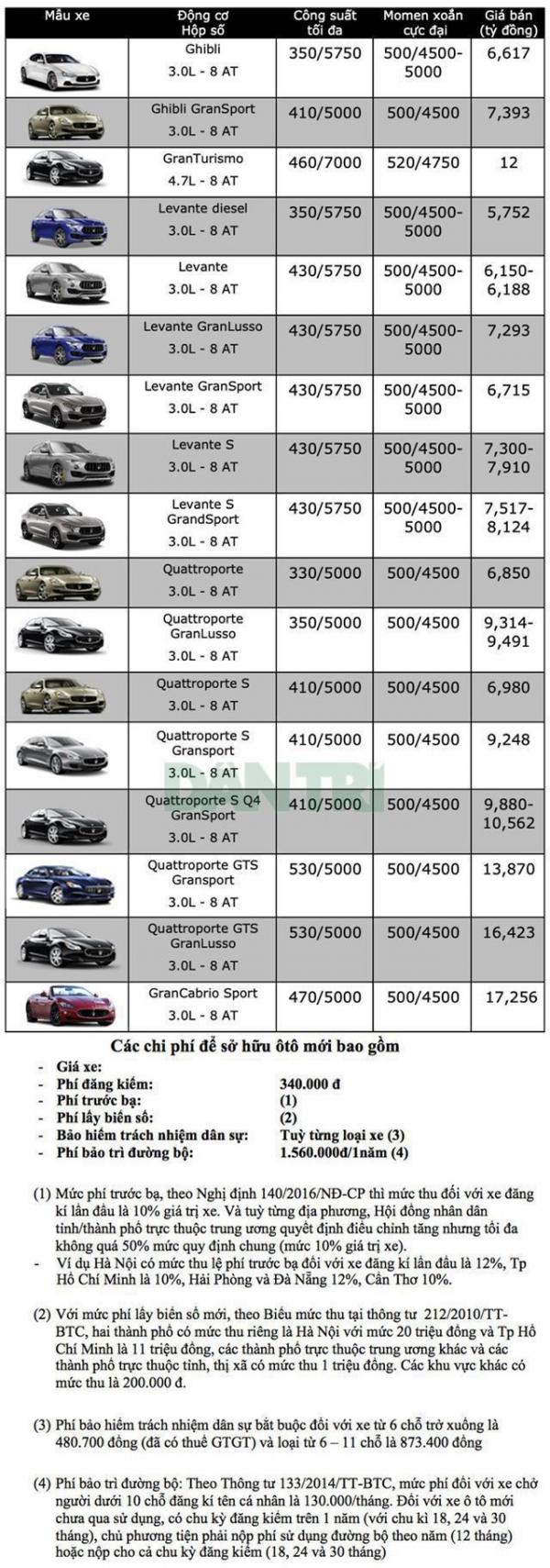 Bảng giá xe Maserati tại Việt Nam cập nhật tháng 5/2019: