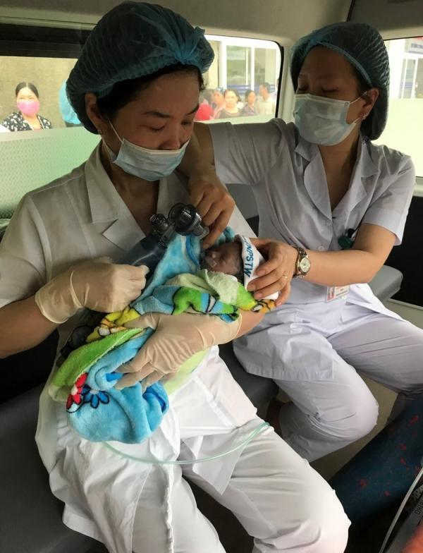 Hình ảnh bé Bình An được đưa lên xe cấp cứu chuyển sang Bệnh viện Phụ sản Trung ương ngay sau sinh.
