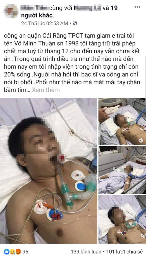 Tuy nhiên trong 2 ngày qua, một người dùng facebook tên M.T đăng trên mạng xã hội Facebook nội dung “tố” Công an Q.Cái Răng tạm giam Võ Minh Thuận. Theo dòng trạng thái của người dùng facebook M.T: “Công an quận Cái Răng, TPCT (TP.Cần Thơ - PV) tạm giam em trai tôi tên Võ Minh Thuận tội tàng trữ trái phép chất m.a tu.ý từ tháng 12 cho đến nay vẫn chưa kết án. Trong quá trình điều tra như thế nào mà đến hôm nay em tôi nhập viện trong tình trạng chỉ còn 20% sống. Nguời nhà hỏi thì bác sĩ và công an chỉ nói bị phổi. Phổi như thế nào mà mặt mài (mặt mày) tay chân bầm tím, miệng vẫn còn m.á.u me, chỉ đợi chờ ch.ết… Mong thẩm quyền tối cao sớm vào cuộc cứu sống em tôi… Làm ơn vào cuộc sớm lấy lại công bằng cho em tôi…”.