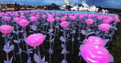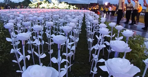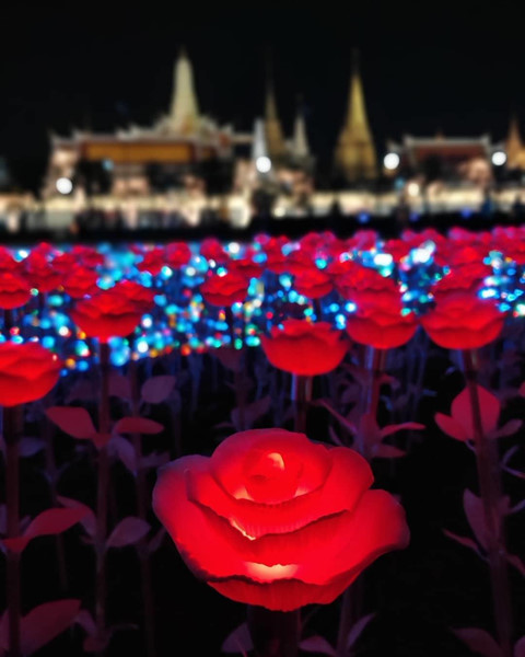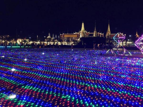 Nằm trong sự kiện chào mừng lễ đăng quang của nhà vua, tại Sanam Luang, Thái Lan, màn trình diễn ánh sáng độc đáo với những cánh đồng hoa thu hút nhiều du khách tham quan.