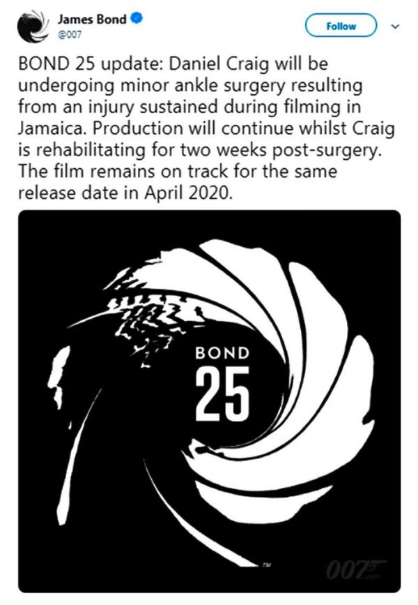 Nam tài t..ử Daniel Craig được bác sĩ yêu cầu phẫu thuật mắt cá chân sau chấn thương. Phía nhà sản xuất cho biết nam diễn viên người Anh đang trong quá trình phục hồi sau phẫu thuật. Ngoài ra, đơn vị này cũng thông báo rằng ngày phát hành của bộ phim sẽ diễn ra như dự kiến vào tháng 4.2020.