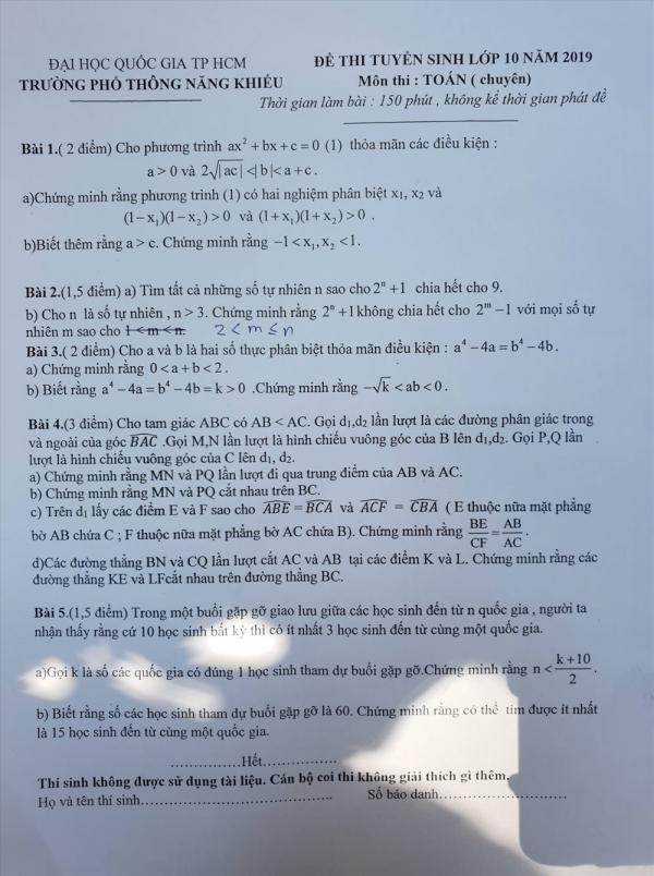 Câu 2b trong đề thi môn Toán (chuyên) của trường Phổ thông Năng khiếu - ĐH Quốc gia TPHCM có sai sót. Sau khi phát hiện, hội đồng thi đã điều chỉnh và thông báo tới thí sinh dự thi.