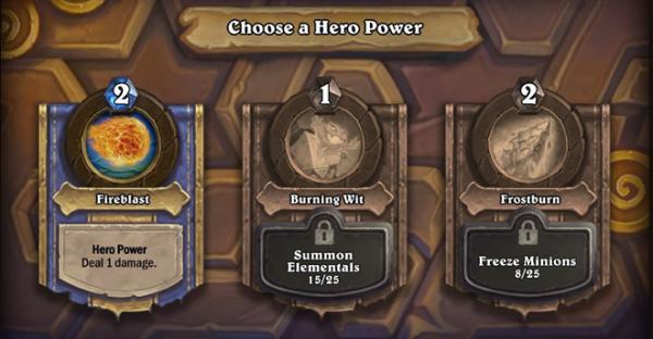 Burning Wit tốn 1 mana với tác dụng giảm giá trị một quân bài ngẫu nhiên thấp hơn 2 mana. Để mở khóa hero power này, các bạn phải triệu hồi được 25 quân bài Elementals. Frostburn tốn 2 mana và cho phép người chơi đóng băng một nhân vật chỉ định. Và để mở khóa nó, người chơi sẽ cần phải đóng băng 25 đơn vị lính.