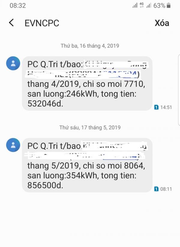 Thông báo tiền điện tháng 4, tháng 5 của chị L.T.L (TP.Đông Hà)