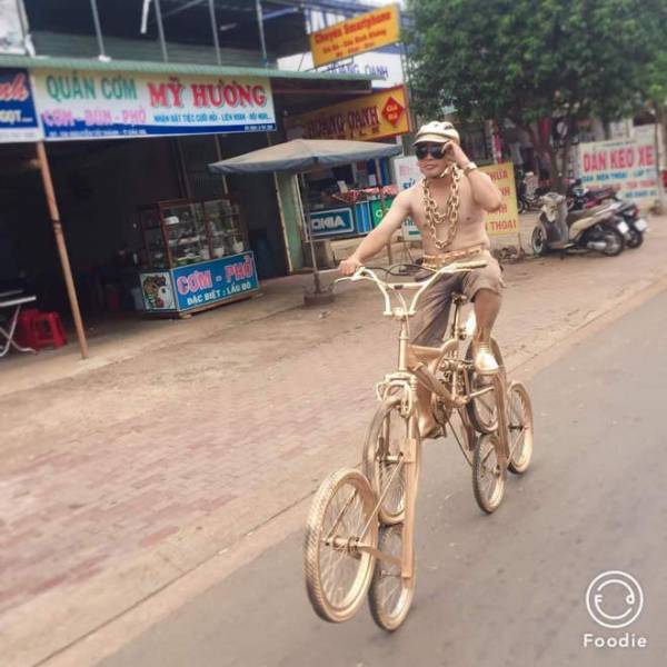 Theo một diễn đàn mạng, mới đây xuất hiện hình ảnh một người đàn ông tầm trung niên đeo trên mình mọi thứ toàn vàng, từ mũ bảo hiểm, vòng cổ dạng mắt xích cho tới đai lưng, và điểm nổi bật nhất đó chính là chiếc xe đạp kỳ dị 6 bánh, được phủ hoàn toàn bằng vàng.