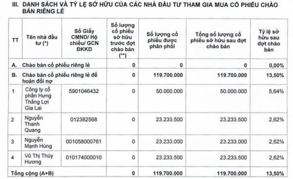 Đầu năm 2018, HNG cũng đã chào bán riêng lẻ 50 triệu cổ phiếu cho Hưng Thắng Lợi để hoán đổi khoản nợ vay hơn 512 tỷ đồng (chốt tại 31/7/2017). Giai đoạn này, HNG đã phát hành 50 triệu cổ phiếu cho Hưng Thắng Lợi với giá bán 10.000 đồng/cp.
