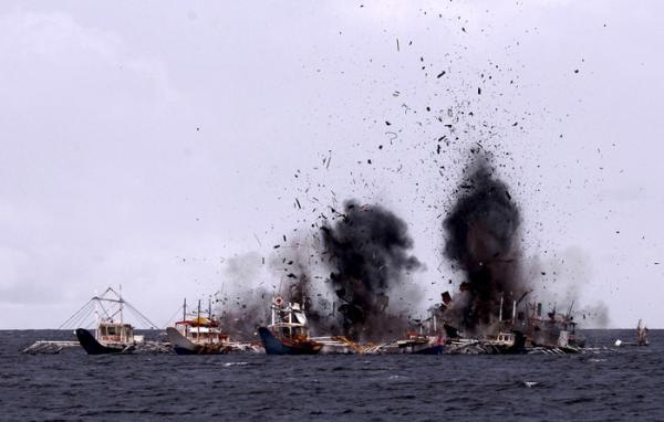 Hơn 500 chiếc thuyền các nước bị đ.ánh chìm, bao gồm 284 thuyền Việt Nam, kể từ tháng 10/2014 đến nay, sau khi bị bắt với cáo buộc đ.ánh bắt trái phép trong vùng biển Indonesia. Chính sách này được người dân ủng hộ nhiệt liệt và khiến Bộ trưởng Hàng hải và Nghề cá Indonesia Susi Pudjiastuti trở thành gương mặt chính trị gia được yêu thích. Nó cũng gây nên căng thẳng và quan ngại từ các nước láng giềng.
