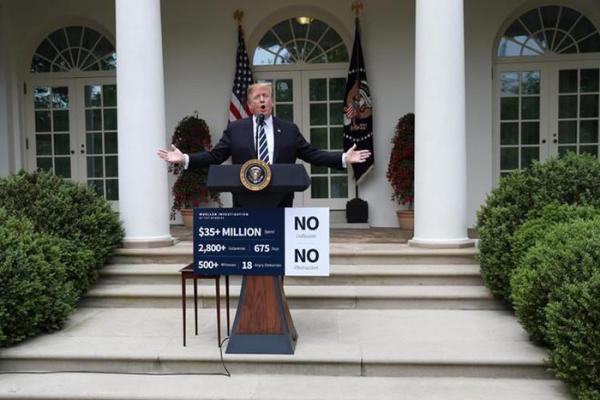 Ông Trump đứng trên bục họp báo cùng tấm biển có ghi “Không cấu kết”, “Không cản trở công lý” kèm nội dung minh họa của kênh ABC News về chi phí cuộc điều tra của công tố viên đặc biệt Robert Mueller, niềm bức xúc từ lâu của tổng thống về các cuộc điều tra của đảng Dân chủ.