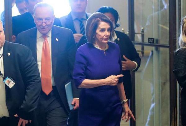 Chủ tịch Hạ viện Nancy Pelosi (váy tím) và lãnh đạo phe Dân chủ tại Thượng viện Chuck Schumer trở về Điện Capitol sau cuộc gặp chỉ kéo dài 3 phút với Tổng thống Trump. Ảnh: AP.