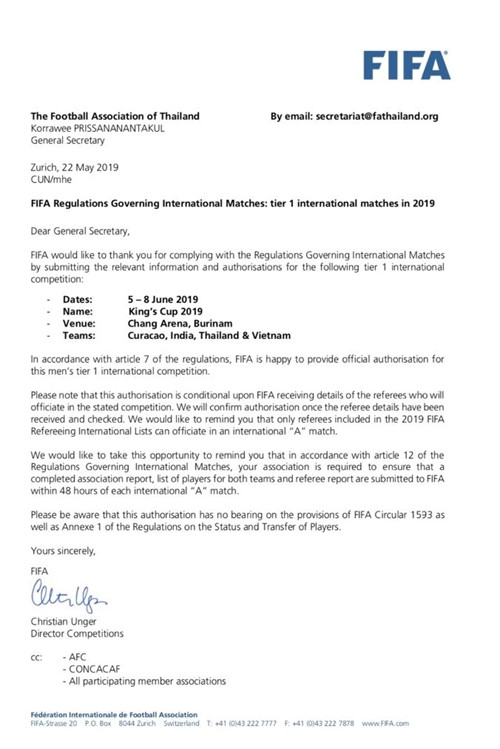 Văn bản của FIFA gửi cho FAT công nhận các trận đấu ở King’s Cup 2019CHỤP MÀN HÌNH