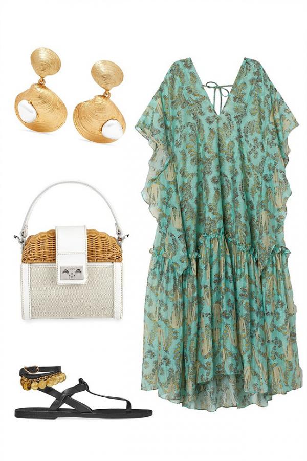 Một chiếc kaftans lụa, sandal có thiết kế lạ mắt và đồ trang sức lấy cảm hứng từ biển, mạ vàng. Túi x.á.ch chất liệu thiên nhiên khiến bạn vừa nổi bật vừa như hòa tan với biển.